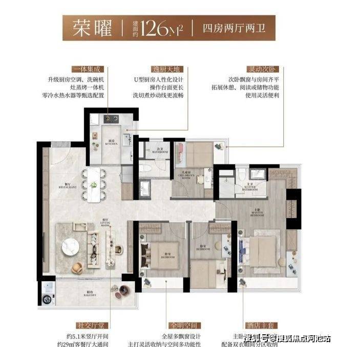 126-130㎡四房两厅两卫:改善终极之选。126㎡经典竖厅5.1米开间,29㎡LDKB一体大通间,四朝南设计尽显大气;130㎡横厅南北通透,五间朝南,玄关可打造800库超强收纳,6.5米阳台贯通客厅与次卧,主卧配备双衣帽间与双面飘窗,尊崇感拉满。
