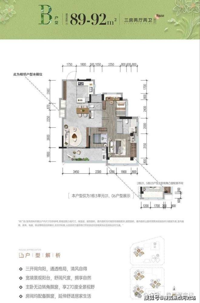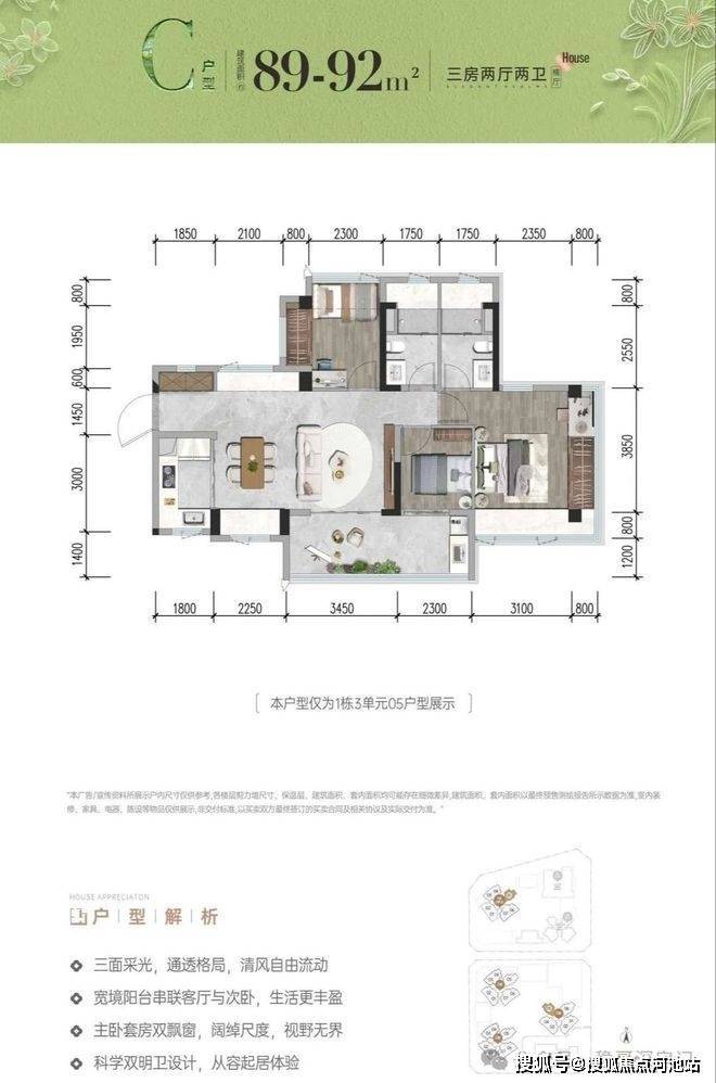 招商会展湾雍境名邸位于宝安沙井大前海会展湾片区的招商会展湾雍境名邸于2025年4月30日取证入市,本次是招商会展湾雍境二期,首推1栋3单元的195套房源,面积段有80㎡3房1卫,91㎡3房2卫,92㎡3房2卫3种户型,是3梯7户的普通高层,预计2027年9月精装交楼。