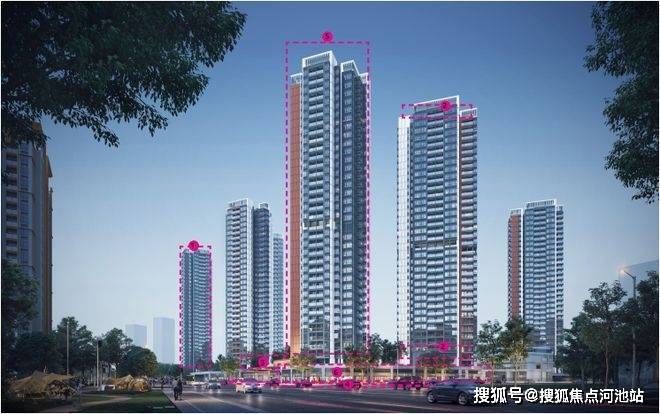 项目共由8栋32-36层高住宅组成,1栋1单元/2栋2单元/3栋1单元住宅33F,1栋2单元/2栋1单元/3栋2单元住宅32F,2栋3单元/2栋4单元住宅36层,4栋是1所9班制幼儿园。