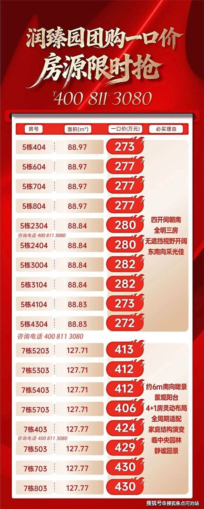 下面是近期推出了一批一口价房源,数量有限先到先得,想要了解某个房号还在不在的话,请联系开发商售楼处电话 400 811 3080 进行咨询了解!
