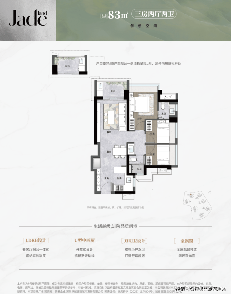 83㎡的3房2厅2卫,设计的是竖厅格局,进门入户玄关,客厅3.2米开间,LDKB一体化,S墙设计预留冰箱卡槽位,U型厨房,主卫少了淋浴,公卫三段式分离,得房率约90.33%(包含赠送),阳台西北朝向。