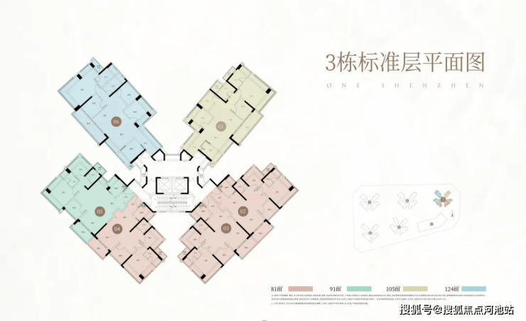 建面81㎡3房2厅2卫、约91㎡4房2厅2卫、约100-105㎡4房2厅2卫、约121-124㎡4房2厅2卫,约148㎡5房2厅2卫,共四种户型。