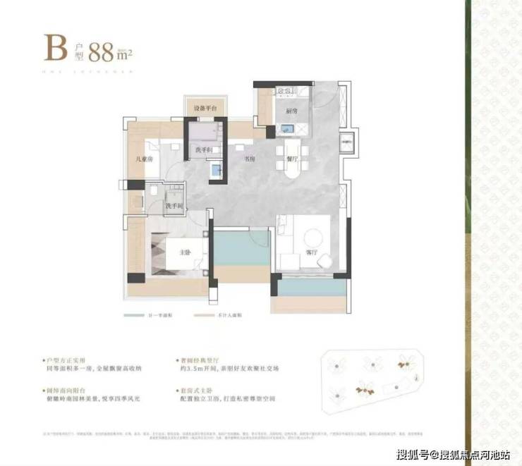 实际使用率(含赠送)在95%左右,相比建筑老规设计,得房率高了10%。79㎡就能做到三房二卫,89㎡能做到四房二卫,99-119㎡四房二卫。