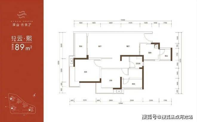 89㎡的3房2厅1卫,E2户型,设计的是竖厅格局,客厅3.6米开间,LDKB一体化设计,3个卧室分别做到了主卧13.5㎡/次卧9.54㎡/次卧8.1㎡(含墙体飘窗),L型厨房还带1个小生活阳台,卫生间三段式分离,得房率:79.89%(不含赠送),东南/西南或正南朝向。