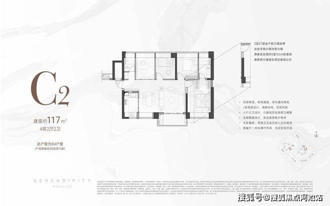 117㎡:4房2厅2卫,横厅户型,分布在1/3栋04/05,是所有户型里面空间利用最高的,阳台东南和西南两种朝向;横厅设计,南北通透,与116㎡同个面积在横厅设计,自然是可以满足南北通透的需求。