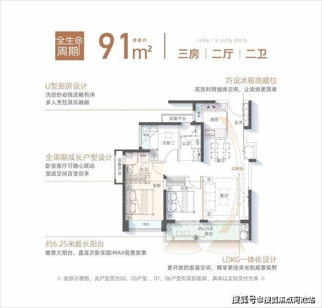 91㎡户型拥享约6.25米南向超长阳台,创变LDKG一体化设计,满足青年家庭成长需求。