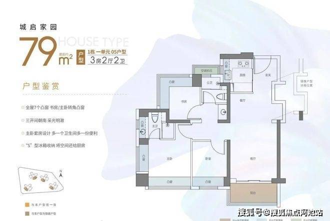 东南或西南朝向,竖厅设计,客厅有预留冰箱位,客厅,主卧,次卧分别朝南,户型一共有8个飘窗,加上阳台和飘窗使用率在90%左右。