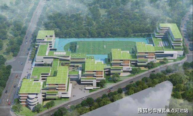 新建54班九年一贯制学校,提供2520个学位,包含初中部、小学部、体育馆、教师宿舍、图书馆与报告厅、餐厅等。