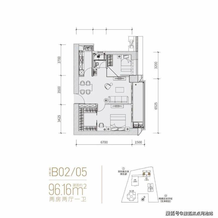 分布在02(东北向)和05(西南向),作为「富通九曜公馆」入门级户型,细看主卧空间很大,硬隔个2+1房还凑合。但无论是二房还是2+1,一卫其实并不匹配福田这个位置的主流群体。