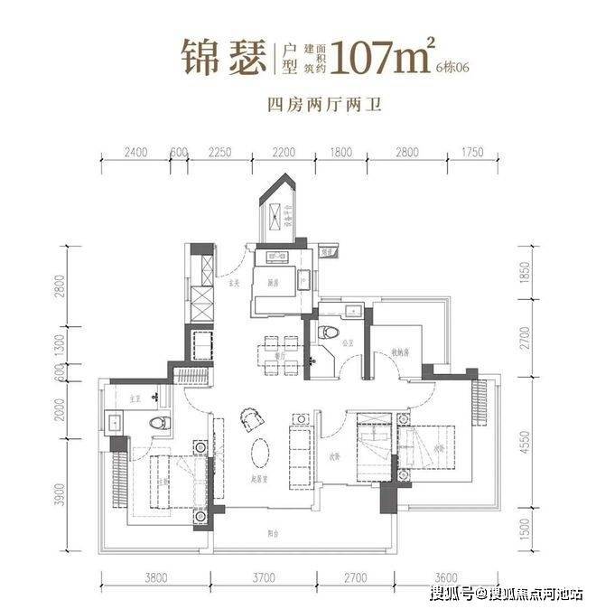 107㎡的4房2厅2卫,双龙抱珠格局,客厅3.7米开间,S墙预留冰箱位,四开间朝南,主卧+2个次卧270°无柱转角飘窗,分别做到了主卧17.94㎡/次卧16.38㎡/次卧7.56㎡/次卧6.89㎡(包含墙体飘窗),U型厨房烟道外置,得房率约104.06%(包含赠送),客厅连接次卧出超大阳台约11.76平,东北朝向。