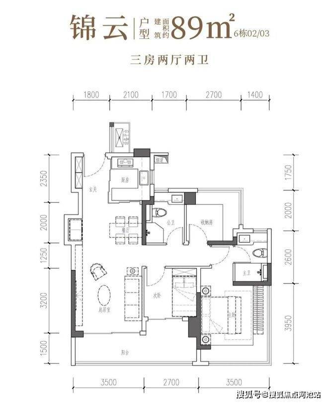 89㎡的3房2厅2卫,6栋02/03户型,设计的是经典竖厅格局,客厅3.5米开间,LDKB一体化,S墙设计预留冰箱卡槽位,三开间朝南,动静分区,主卧+次卧270°无柱转角飘窗,分别做到了主卧15.25㎡/次卧7.56㎡/次卧6.48㎡(包含墙体飘窗),U型厨房烟道外置,卫生间干湿分离,得房率约97.47%(包含赠送),客厅连接次卧出大阳台约11.46平,西南或东南朝向。主要区别在于次卧跟主卫空间。