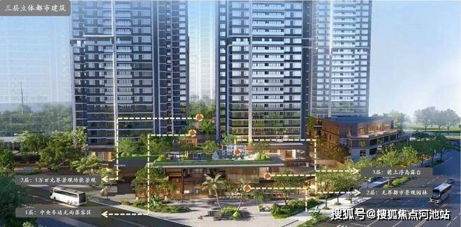 ① 空间设计:采用三层立体都市空间布局,含约1000㎡社区大堂北侧落客区(中央车站)、约2000㎡里巷式街区商业(廊下烟火商业街区)、约1000㎡抬高式檐上浮岛花园露台(檐上浮岛露台);
