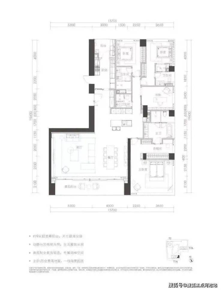 户型四套间设计,配备工人房,主佣分区,竖厅布局,约12m双厅进深,空间利用率很高。东端头位置,所有卧室都有开阔的景观,270°景观完全无遮挡。只存在T1B栋33-38层,仅6套。