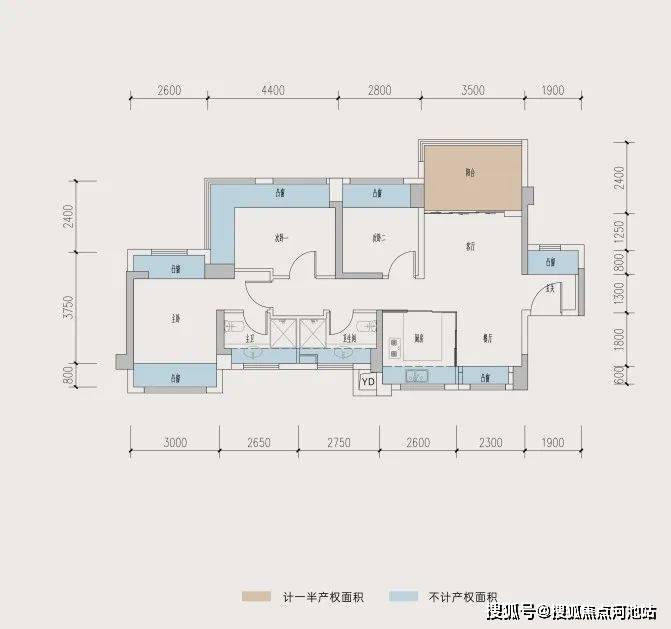 89㎡3房横厅户型使用率,赠送面积达到了22.92㎡,地毯率达到了92.57%,套内加赠送使用率能达到102.58%。