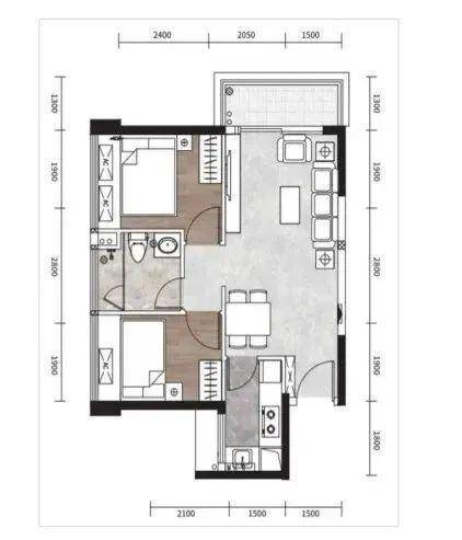 64㎡的2房2厅1卫,设计的竖厅格局,进门玄关,客厅3.3米开间,客餐厅一体化,L型厨房,卫生间干湿分离,得房率约73%(包含赠送),仅有几套可售。此户型集中在1B栋,这一栋里面有很多是回迁房,所以可售的不多。