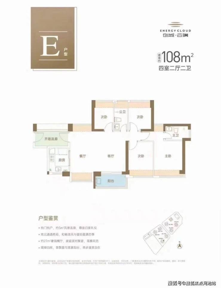 108㎡的4房2厅2卫,设计横厅格局,南北通透,仅2栋4单元1条腿有这个户型。