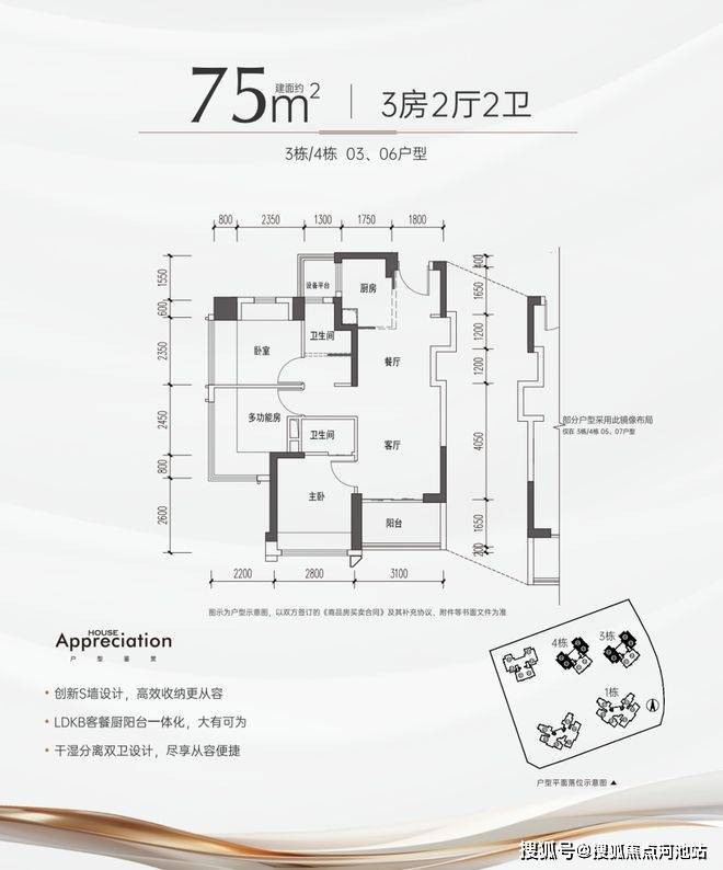 2、超高使用率,按照新规设计,75㎡-95㎡3-4房,能满足不同家庭居住需求,75㎡做到三房二卫,95㎡做到四房两卫;