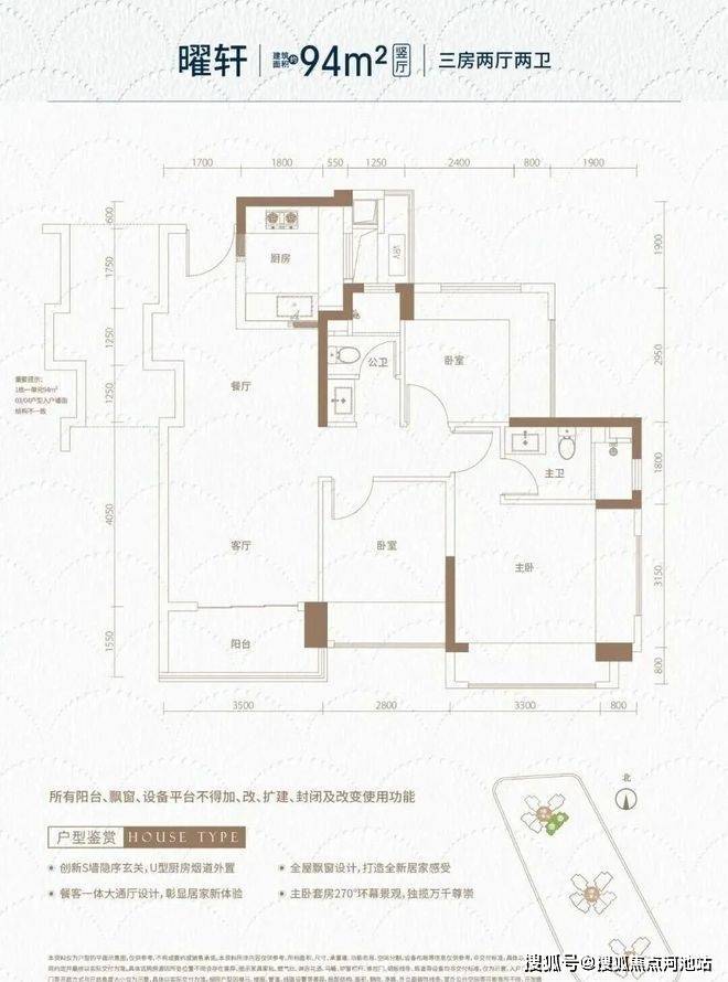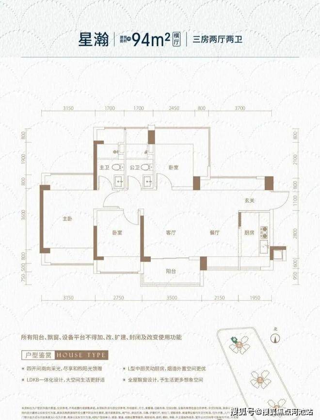 94㎡的3房2厅2卫(横厅),设计的是横厅南北通透格局,独门独户,进门入户玄关,客餐厅5.65米开间,LDKB一体化,全屋10面飘窗,主卧南北通,分别做到了主卧16.38㎡/次卧12.02㎡/次卧9.9㎡(包含墙体飘窗),L型厨房,卫生间干湿分离,得房率约105%(包含赠送),阳台约5.42㎡主朝西南向。