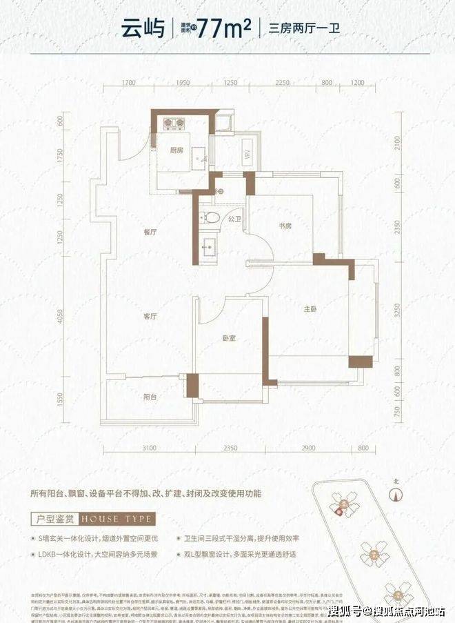 78㎡-3房2厅1卫,设计的是经典竖厅格局,客厅3.1米开间,LDKB一体化,S墙设计预留冰箱卡槽位,动静分区,三开间朝南,分别做到了主卧15.1㎡/次卧8.99㎡/次卧8.34㎡(包含墙体飘窗),U型厨房烟道外置,卫生间三段式分离,还带1个设备平台,得房率约100%(包含赠送),阳台约4.8㎡西南朝向。
