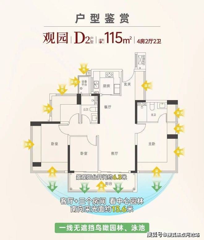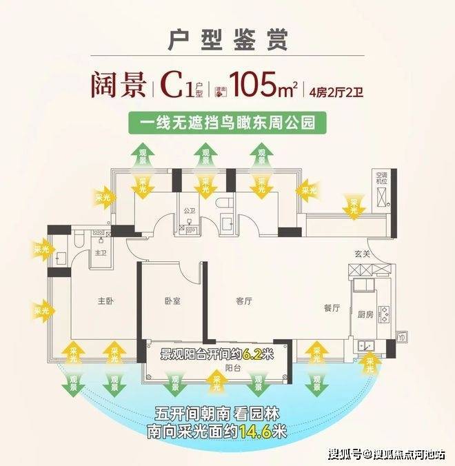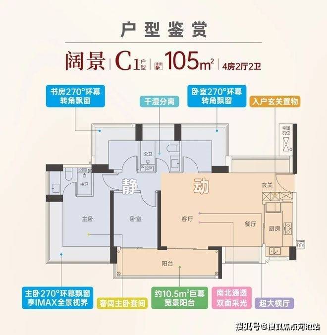 “建面约105m²,兼容“南北通透”与“大横厅”设计。