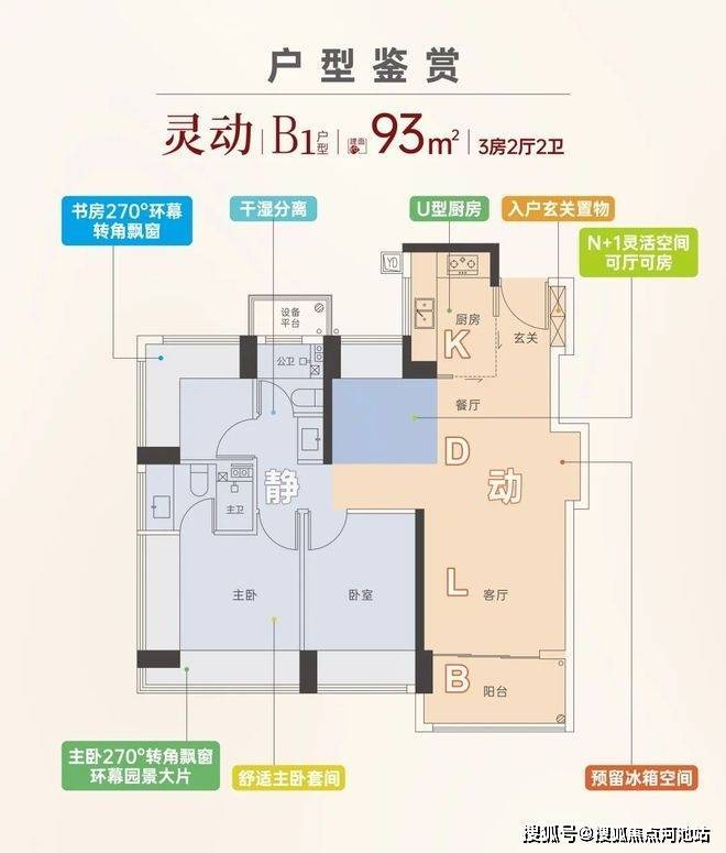 “建面约93m²“可生长”户型,演绎”3+1”房的灵动布局。