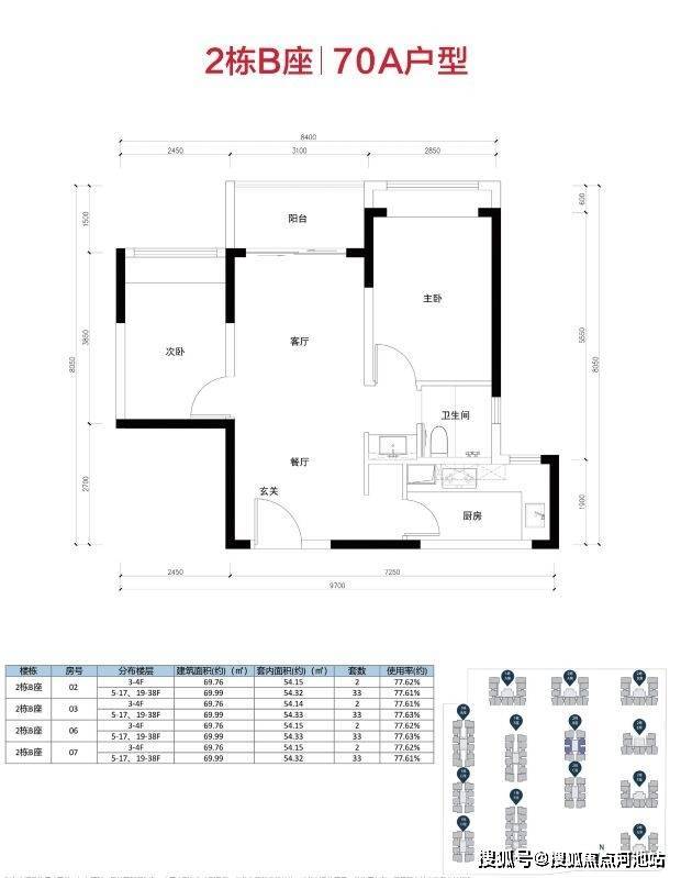 70A为“双龙抱珠”户型,采光面大,卧室、客厅空间舒适性较好;