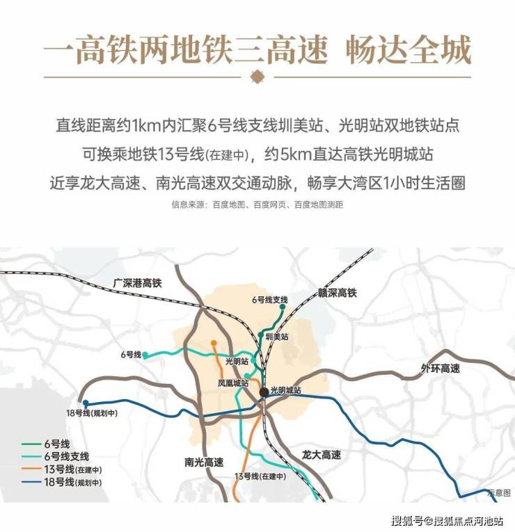 直线距离约1km内汇聚6号线支线圳美站、光明站双地铁站点可换乘地铁13号线(在建中),约5km直达高铁光明城站
