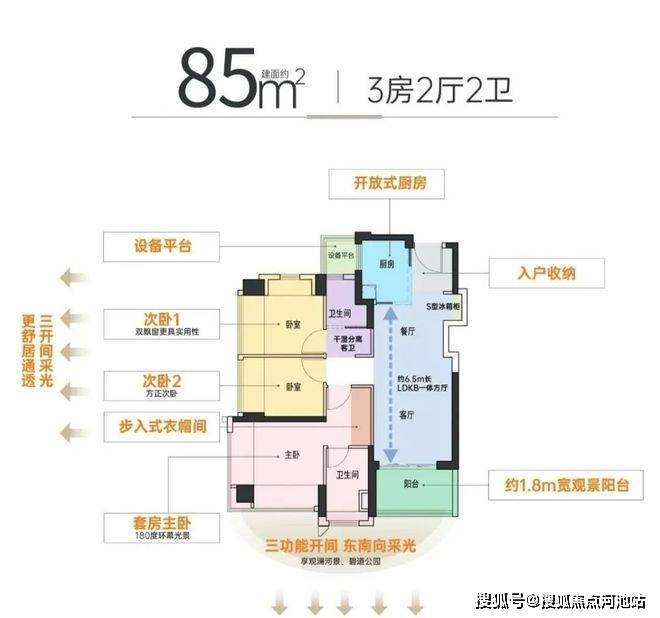 新规升级75㎡做2卫,市场同面积做1卫,卧室180度环幕采光,S型墙体设计冰箱位,使用空间更合理,干湿分离两空间公卫,兼并走廊空间更宽阔,客餐厅一体化设。