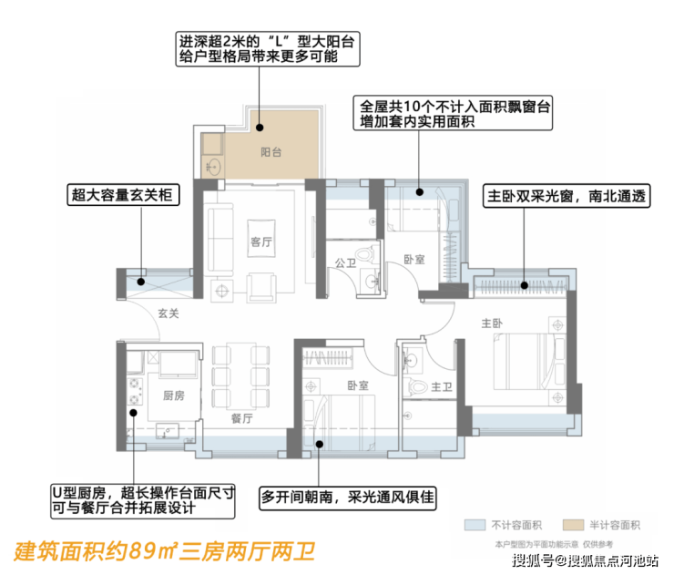 ●配备局部进深达2.1米、约6.2㎡的L型大阳台;