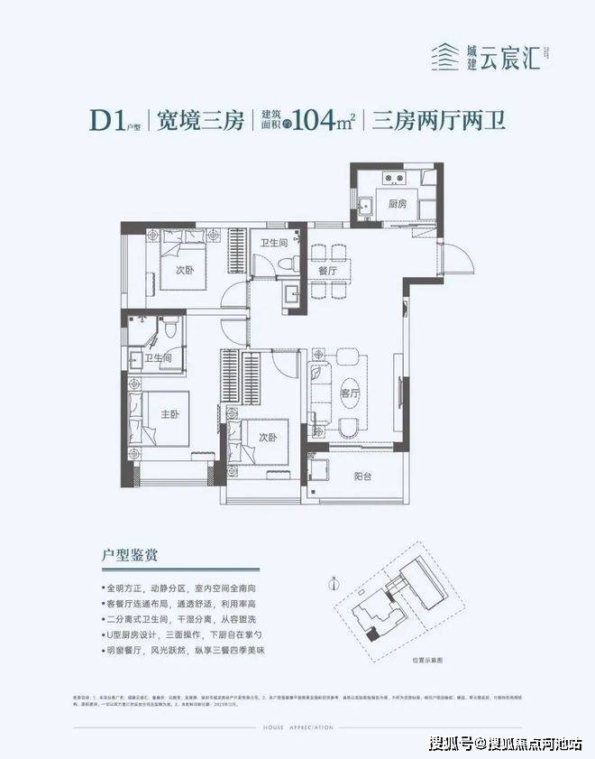 104㎡的3房2厅2卫,设计的竖厅南北通透格局,餐客厅一体化,U型厨房,阳台西南朝向。