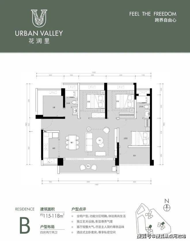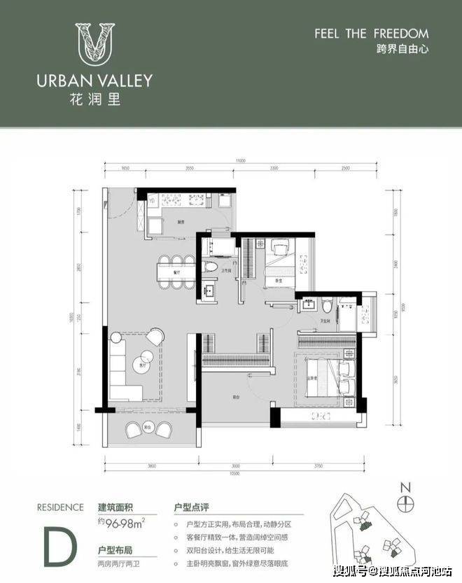 双阳台双卫设计,约3.5m舒适客厅开间,宽厅空间阔绰,动静分区,户型方正实用。