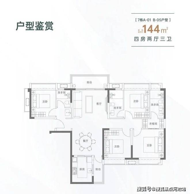 144㎡的4房2厅3卫,设计的是竖厅南北通透格局,进门入户玄关,LDKB一体化设计,双主卧套房,L型厨房还带1个生活阳台,公卫干湿分离,得房率约82%(不含赠送),阳台主朝西北向。