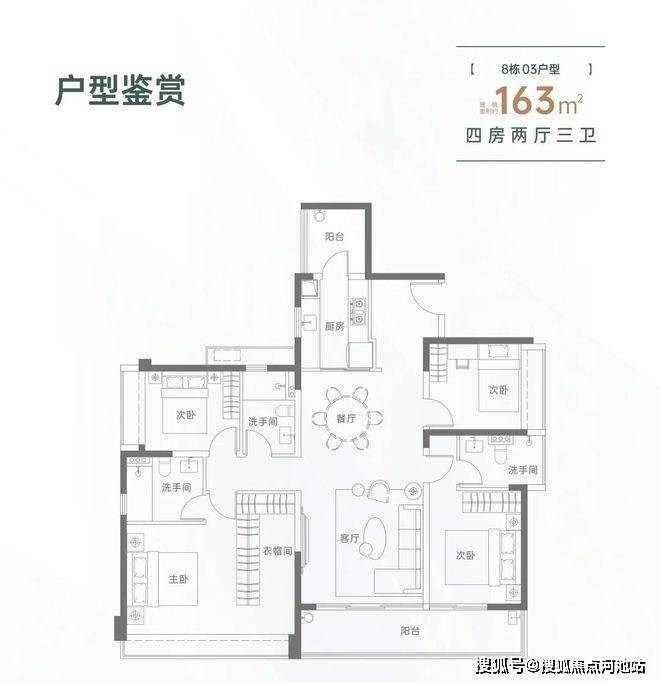 163㎡的4房2厅3卫,设计的是竖厅格局,一梯一户,进门入户玄关,LDKB一体化设计,三开间朝南,双主卧套房,客厅连接次卧出大阳台,L型厨房还带1个生活阳台,卫生间干湿分离,得房率约82%(不含赠送),东南朝向。