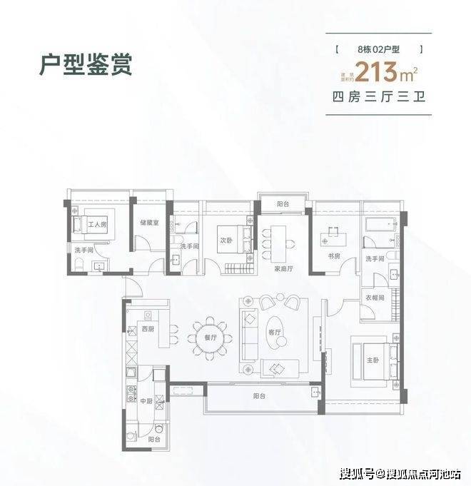 213㎡的4房3厅3卫,设计的是横厅南北通透格局,一梯一户,进门入户玄关,LDKB一体化设计,四开间朝南,双阳台通透,主卧大套间设计,还配有保姆独立套房,中西型多功能厨房,卫生间干湿分离,得房率约82%(不含赠送),阳台主朝东南向。