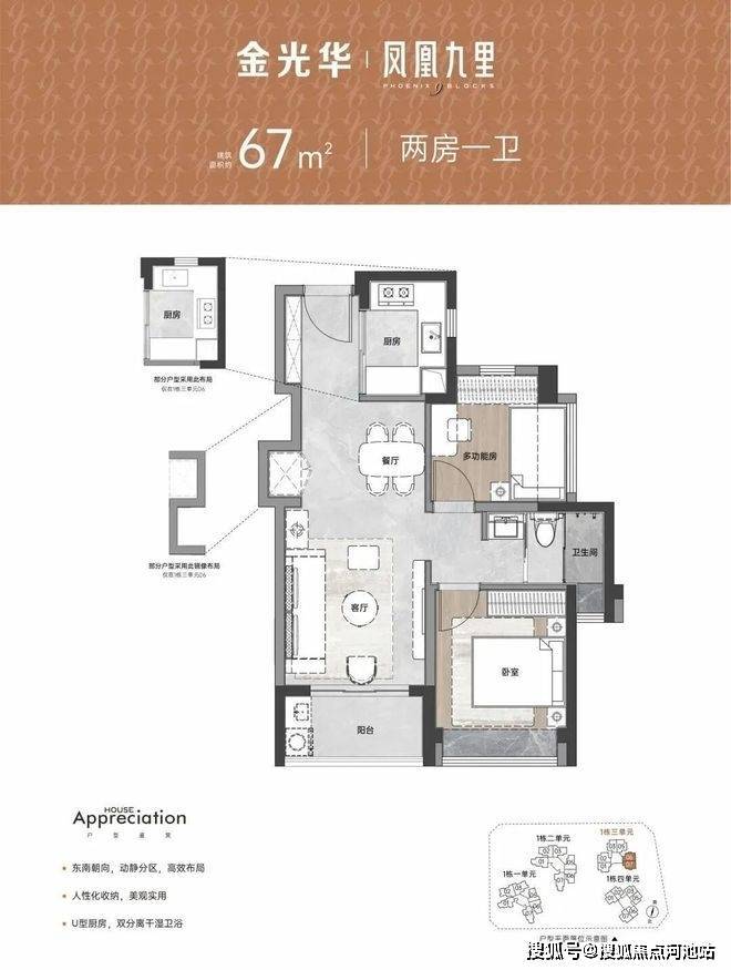 竖厅格局,S墙设计预留冰箱位,双次卧双面采光,U型厨房,卫生间三段式分离设计,有西南朝向及东南朝向。