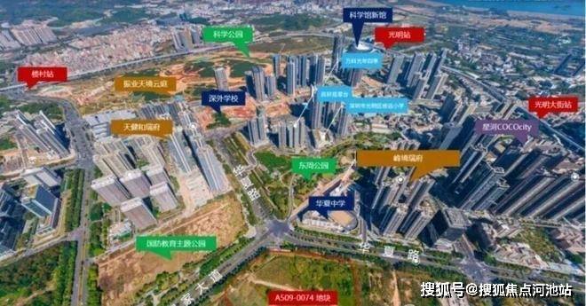 振业天境云庭,位于深圳光明中心区核心腹地,华夏路与周家大道交汇处,紧邻华夏中学,坐拥科学公园绿轴景观。项目所在区域原为工业用地,经规划调整后转型为低密度居住区,容积率仅3.1,远低于周边竞品。北侧为东周文化公园、国防教育主题公园及木墩村公园,东侧紧邻东周小学等优质教育资源,西侧与南侧为待开发空地,保证了开阔的景观视野和低密度居住体验。项目处于光明科学城规划的"产业转化区"与"生活服务中心"交汇处,直接受益于科学城人才导入和区域价值提升。