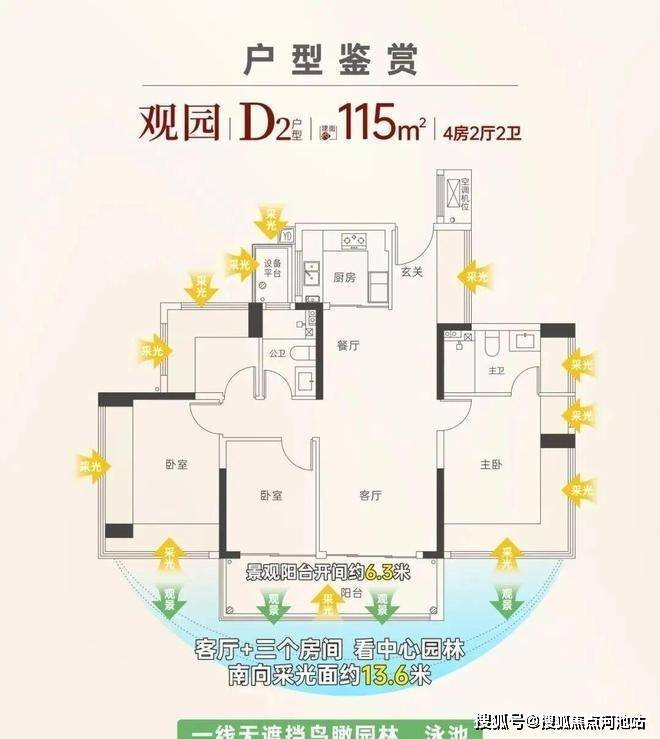 166㎡四房两厅两卫:南北双阳台设计,主卧270°大飘窗,客厅面宽约6.2米,五开间朝南,空间尺度感媲美豪宅;