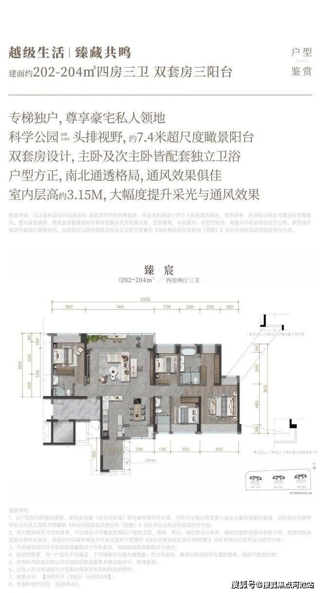 满京华金硕臻府本次推出1栋1/2/3单元,共420套房源,面积有138-139㎡的4房2厅2卫,202-204㎡的4房2厅3卫户型,作为光明顶豪楼盘,金硕臻府做到了一梯一户,专梯入户的奢阔大空间,3.15米层高,车位比1比1.6,其中光明仅有的204平大户型基本是千万起步门槛,预计在2026年10月份交房,138平户型带精装交房,204平户型带简装交房。