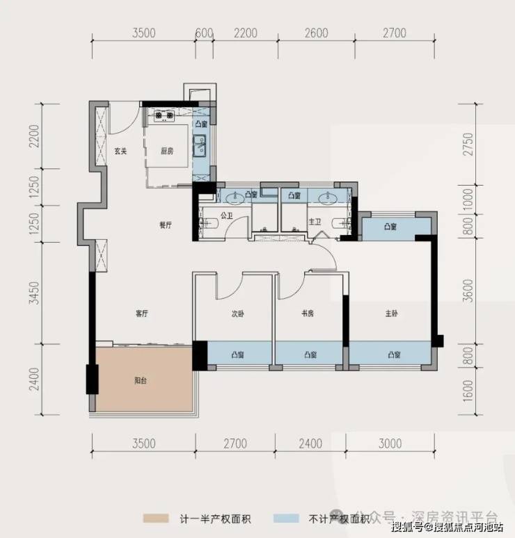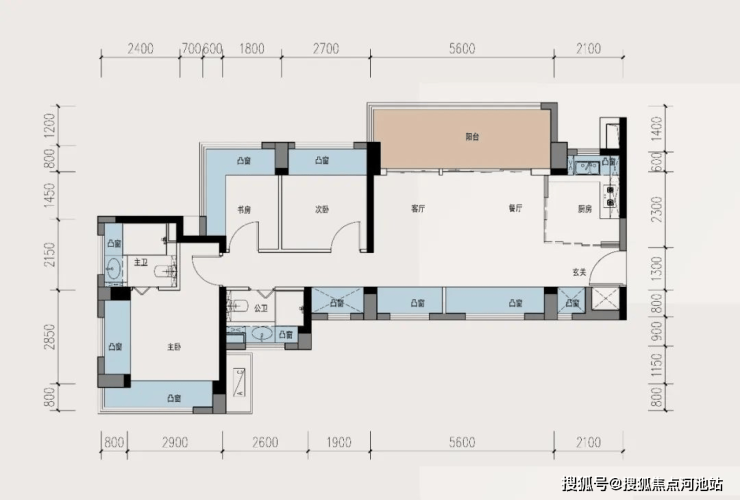 这个89平的E户型,应该是这次公布的三个户型里面赠送最多的一个户型了,从厨房到客厅到卧室到卫生间,全部都有凸窗。另外还有5.6米的大阳台,这个在89平的户型里面真的不多见,算是很奢侈了。总结一句话,飘窗利用好,我的得房率就吊打一切新房。