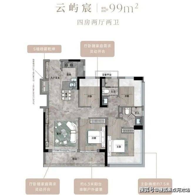 99㎡的4房2厅2卫,设计的是竖厅格局,客厅3.35米开间,LDKB一体化,S墙设计预留双开门冰箱卡槽位,三开间朝南,动静分区,U型厨房,公卫三段式干湿分离,赠送设备平台,得房率约78.27%(不含赠送),客厅连接次卧出9.37m²大阳台西南或东南朝向。靓点:99平做到了4房2卫,主卧270°无柱转角飘窗,厨房烟道外置+额外赠送设备平台,并且是纯南向格局。