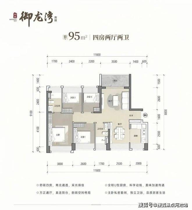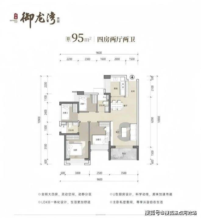 95㎡4房2卫,分布在2栋1单元/3栋03/04户型,设计的是经典竖厅格局,客厅开间3.5米,LDKB一体化设计,三开间朝南,U型厨房,卫生间干湿分离设计,得房率约79.25%(不含赠送),东南或西南朝向,加上赠送得房率约88%