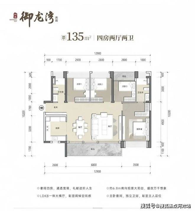 135㎡4房2卫,设计的是横厅南北通透格局,客餐厅开间6.8米,LDKB一体化设计,四开间朝南,U型厨房,公卫三段式分离设计,得房率约79.25%(不含赠送),阳台主朝东南或西南向,加上赠送得房率约90%
