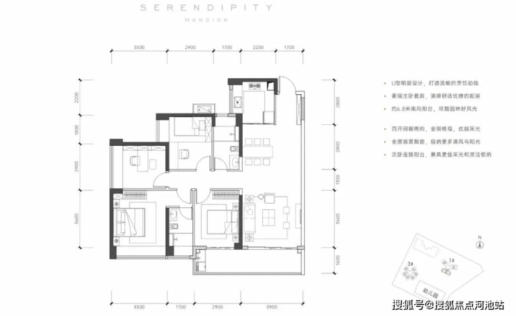 横厅户型,分布在3栋01/02,是所有户型里面空间利用最高的,阳台东南和西南两种朝向;大阳台+大客厅的设计,符合年轻人口味,卧室均设置飘窗,空间利用率更高。缺点厨房、餐厅受隔壁户型遮挡。