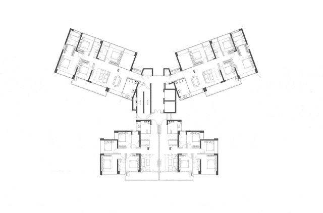 3单元住宅,3梯6户,3种户型,分别为111㎡、116㎡和117㎡4房2卫户型