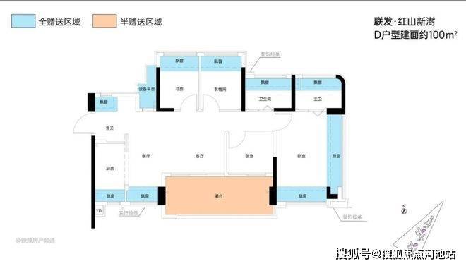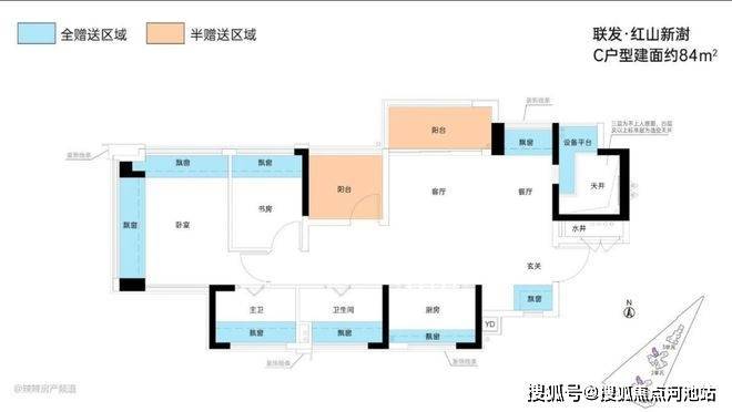 这是红山板块上车门槛最低的三房户型,采用竖厅LDKG+X格局设计,客厅3米开间,S墙设计预留冰箱卡槽位,三开间朝南,动静分区。主卧带双飘窗,U型大厨房,厨房烟道外置设计释放更多操作空间,卫生间三段式干湿分离。赠送双阳台一半面积加5面飘窗加1个设备平台,得房率超100%,空间极致利用,是刚需客户上车的首选。