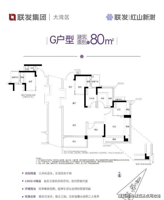 这是红山板块唯一一个80平方米以下做到三房两卫的户型,极其稀缺。竖厅LDKG+X格局,客厅3.4米开间,S墙设计预留冰箱卡槽位,三开间朝南,动静分区。主卧带双飘窗,U型大厨房,厨房烟道外置设计,双卫生间干湿分离。赠送双阳台一半面积加6面飘窗加双设备平台,得房率超100%,能够满足刚需家庭的实际居住需求。