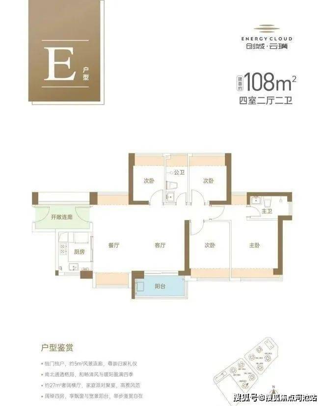 建面约108㎡南北通透4房2厅2卫,阔绰大横厅,演绎多样家庭生活场景,东南向户型,3面采光,生活洒满阳光。