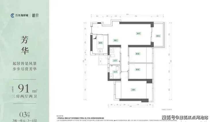 91㎡的3房2厅2卫,设计的是竖厅格局,客厅3.35米开间,LDKB一体化,S墙设计预留冰箱卡槽位,动静分区,U型厨房,公卫干湿分离,得房率约94%(包含赠送),阳台5.7m²东北朝向。赠送面积约11.27m²。