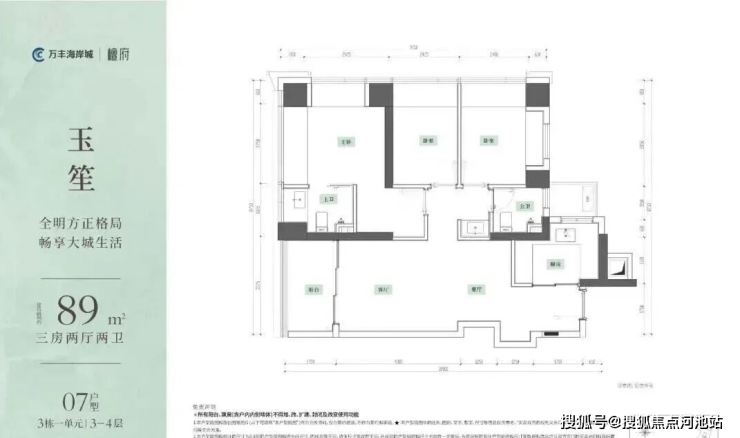 89㎡的3房2厅2卫,设计的是竖厅格局,客厅3.375米开间,LDKB一体化,S墙设计预留冰箱卡槽位,三开间朝南,动静分区,U型厨房,公卫三段式干湿分离,得房率约95%(包含赠送),阳台5.9m²西南朝向。赠送面积约14.69m²。