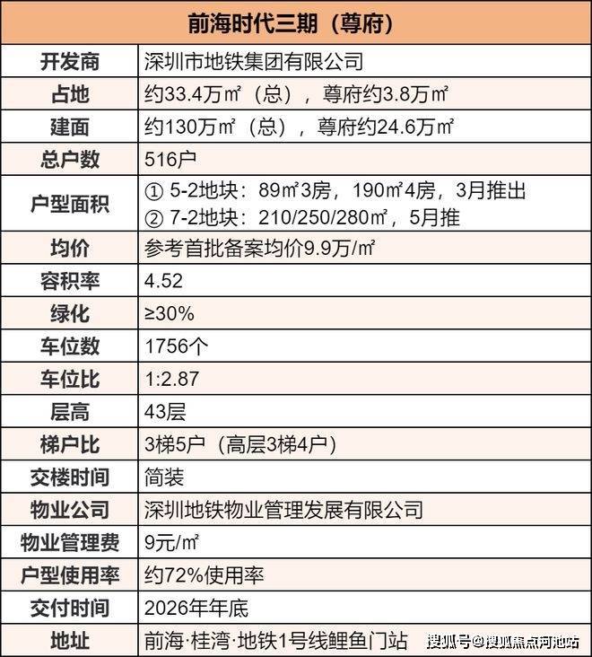 最新消息:位于深圳前海核心地段的标杆住宅——前海时代三期(尊府),项目预计本周五拿证,预计6月中旬开盘入市,即将推出53栋三单元89㎡和190㎡共172套,预计6月中上旬开盘入市,预计2026年12月31日简装交房,价格可参考4月推出58栋245-285㎡大平层,备案均价11.55万/㎡,折后约9折,折后单价约10.4万/㎡。